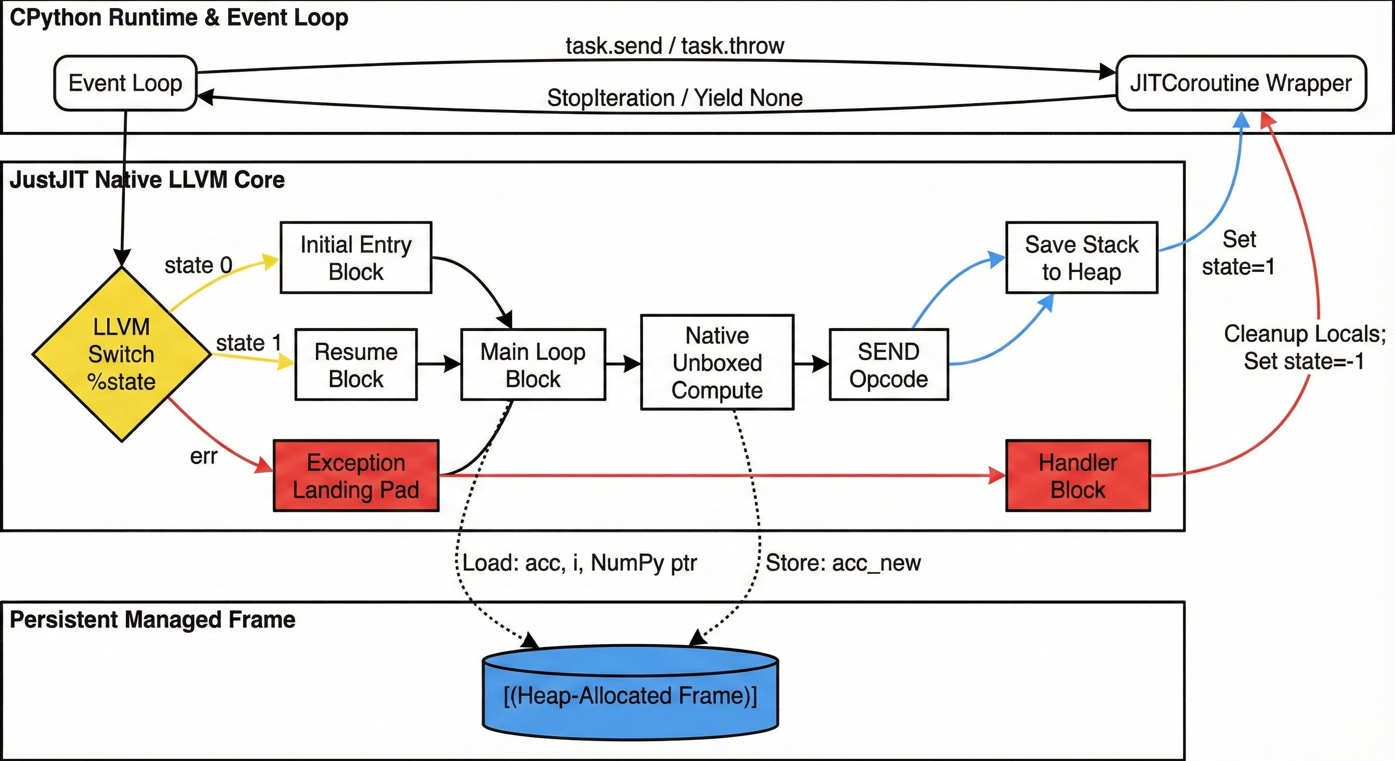 When a coroutine hits an await, the native CPU stack is typically destroyed as control returns to the event loop. To solve this, JustJIT implements a CPS (Continuation-Passing-Style) transformation. We break the function into discrete LLVM basic blocks and use a persistent, heap-allocated frame to store local variables like acc and NumPy pointers.