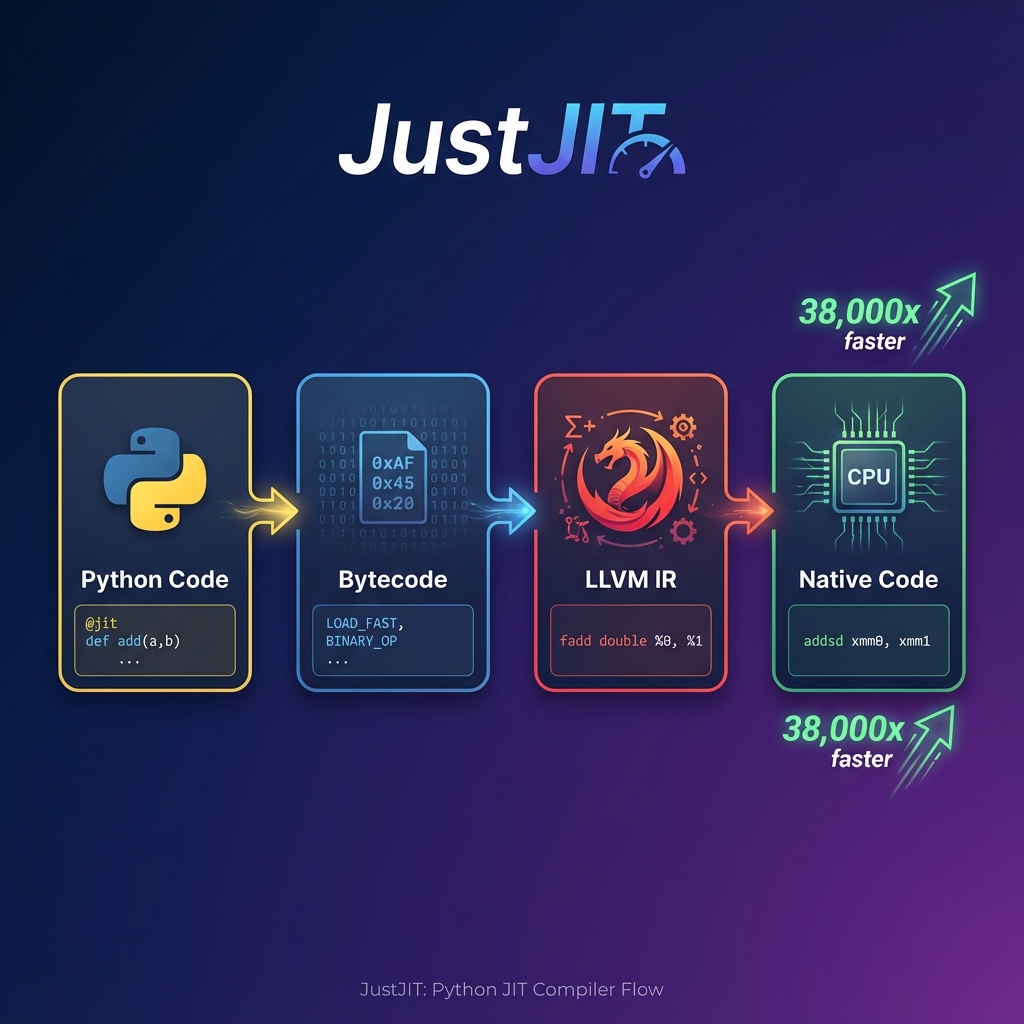 Python is great for productivity, but let's be honest—it's not winning any speed contests. That's why I've been building JustJIT, a JIT compiler that takes Python bytecode and compiles it straight to native machine code using LLVM.